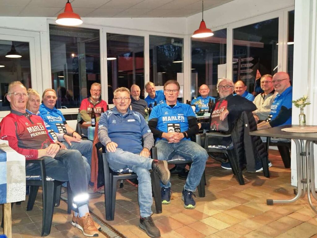 Im Rahmen eines gemütlichen Abends in den Räumlichkeiten des Guido-Heiland Bades sollte noch einmal eine Rückschau auf die Pilgertour 2024 stattfinden. Thomas Katanek und Ludger Breitfeld hatten Bild- und Videomaterial der Pilgertour bearbeitet, weitere Bilder steuerte Volker Marx bei. Mit viel Freude und von manchen flotten Sprüchen begleitet ließen die Anwesenden die Tour passieren.